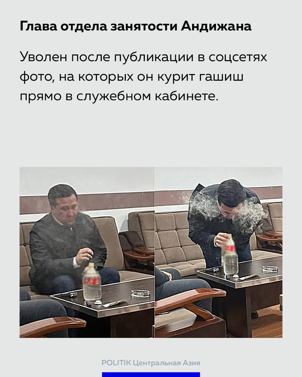Глава отдела занятости Андижана. Уволен после публикации в соцсетях фото, на которых он курит гашиш прямо в служебном кабинете.