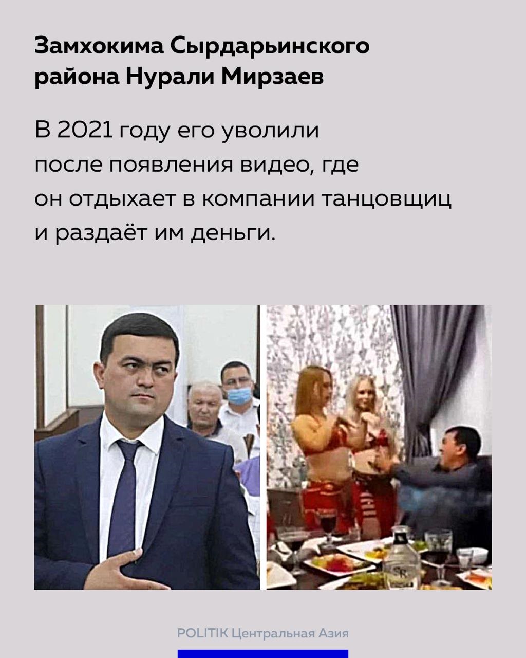 Замхокима Сырдарьинского района Нурали Мирзаев уволен в 2021 году после появления видео, где он отдыхает в компании танцовщиц и раздает им деньги.