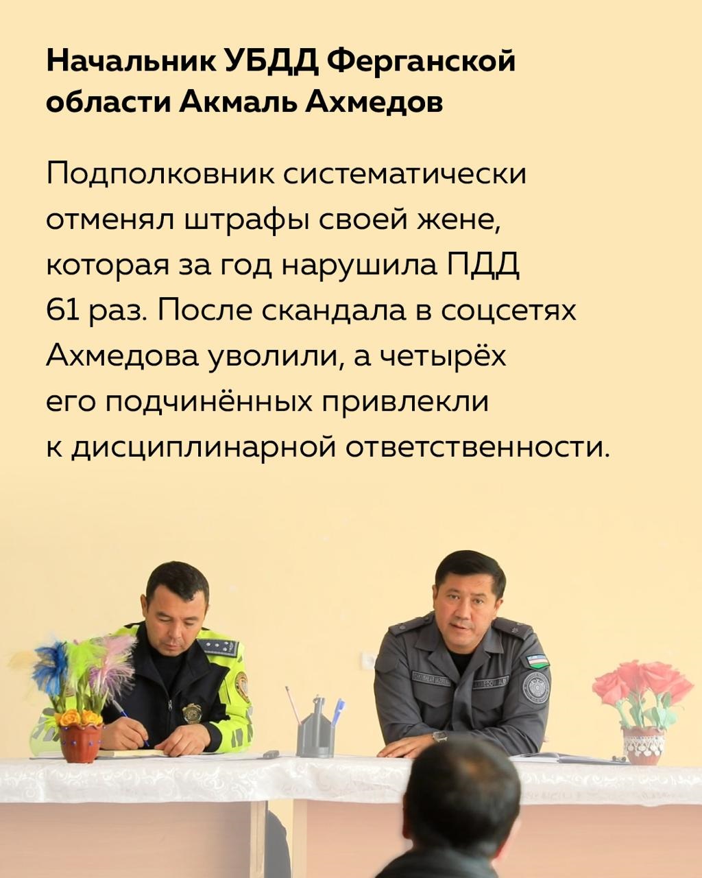 Начальник УБДД Ферганской области подполковник Акмаль Ахмедов систематически отменял штрафы своей жене, которая за год нарушила ПДД 61 раз. После скандала в соцсетях его уволили, а четырех его подчиненных привлекли к дисциплинарной ответственности.