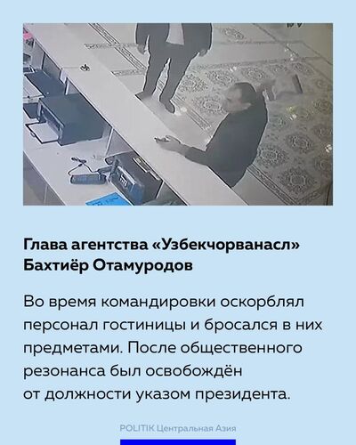 Глава агентства «Узбекчорвансл» Бахтиер Отамуродов во время командировки оскорблял персонал гостиницы и бросался в них предметами. После общественного резонанса освобожден указом президента.