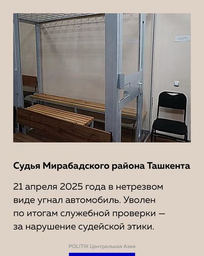 Судья Мирабадского района Ташкента 21 апреля 2025-го в нетрезвом виде угнал автомобиль. Уволен по итогам служебной проверки — за нарушение судейской этики.
