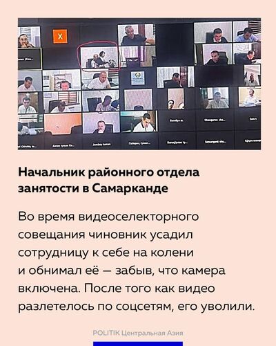 В Самарканде произошел большой скандал после того, как достоянием широкой общественности стала запись с рабочего совещания местных чиновников, проходившего в видеоформате. На одном из кадров руководитель районного отдела Министерства занятости и сокращения бедности Узбекистана усадил к себе на колени свою секретаршу и обнимал ее, забыв, что камера включена.