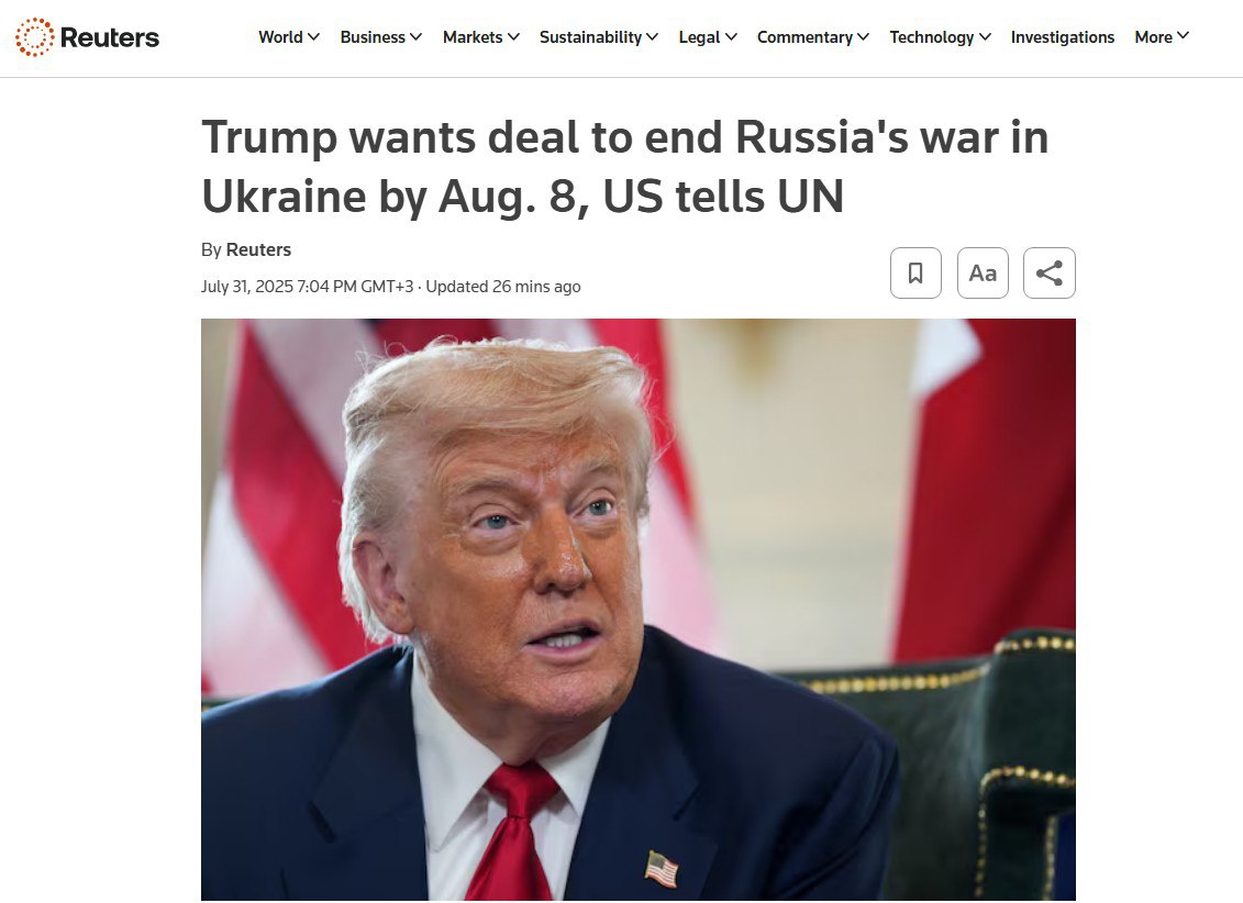 «И РФ, и Украина должны договориться о прекращении огня и прочном мире. Пришло время заключить сделку. Президент Трамп ясно дал понять, что это должно быть сделано к 8 августа», — сказал он.