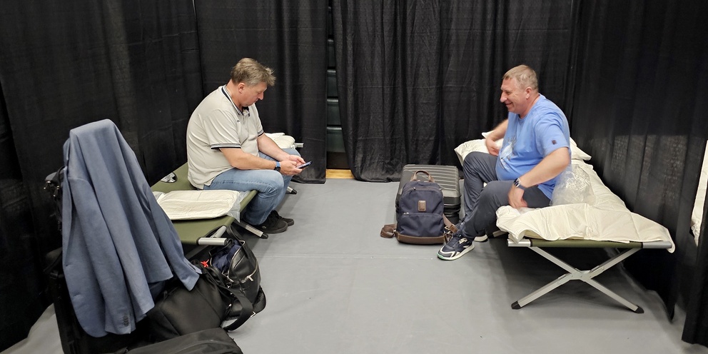 Отмечается, что для работников прессы в спортивном комплексе установили спальные места с перегородками из шторок. Репортерам кремлевского пула предстоит отдыхать на раскладушках. В комплексе также установили указатели на русском языке.