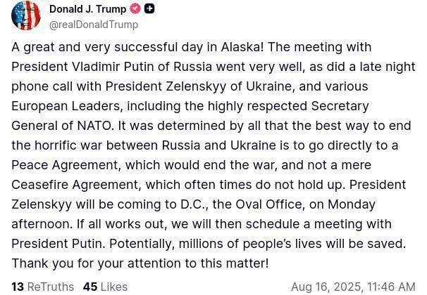 «Прекрасный и очень успешный день на Аляске! Встреча с президентом России Владимиром Путиным прошла очень хорошо, как и ночной телефонный разговор с президентом Украины Владимиром Зеленским и различными европейскими лидерами, включая высокоуважаемого генерального секретаря НАТО», — написал в своей соцсети Truth Social президент США.