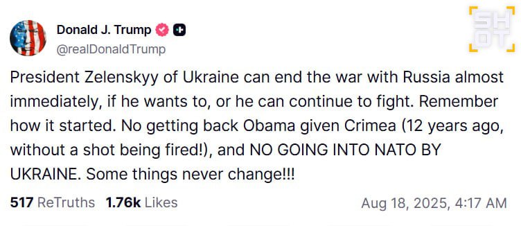 «Президент Украины Зеленский может почти сразу же положить конец войне с Россией, если захочет, или же продолжить борьбу. Вспомните, как все началось. Никакого возвращения Крыма, отданного Обамой (12 лет назад, без единого выстрела!) — и никакого вступления Украины в НАТО. Некоторые вещи никогда не меняются!!!» — написал глава Белого дома в своей соцсети Truth Social накануне визита президента Украины в Вашингтон.