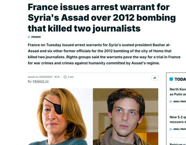 Уточняется, что суд во Франции выдал ордера на арест бывшего президента Сирии и шести бывших высокопоставленных чиновников его администрации, в том числе его брата бывшего главы 4-й сирийской бронетанковой дивизии Махера Асада, начальника разведки Али Мамлюка и бывшего начальника штаба армии Али Аюба.
