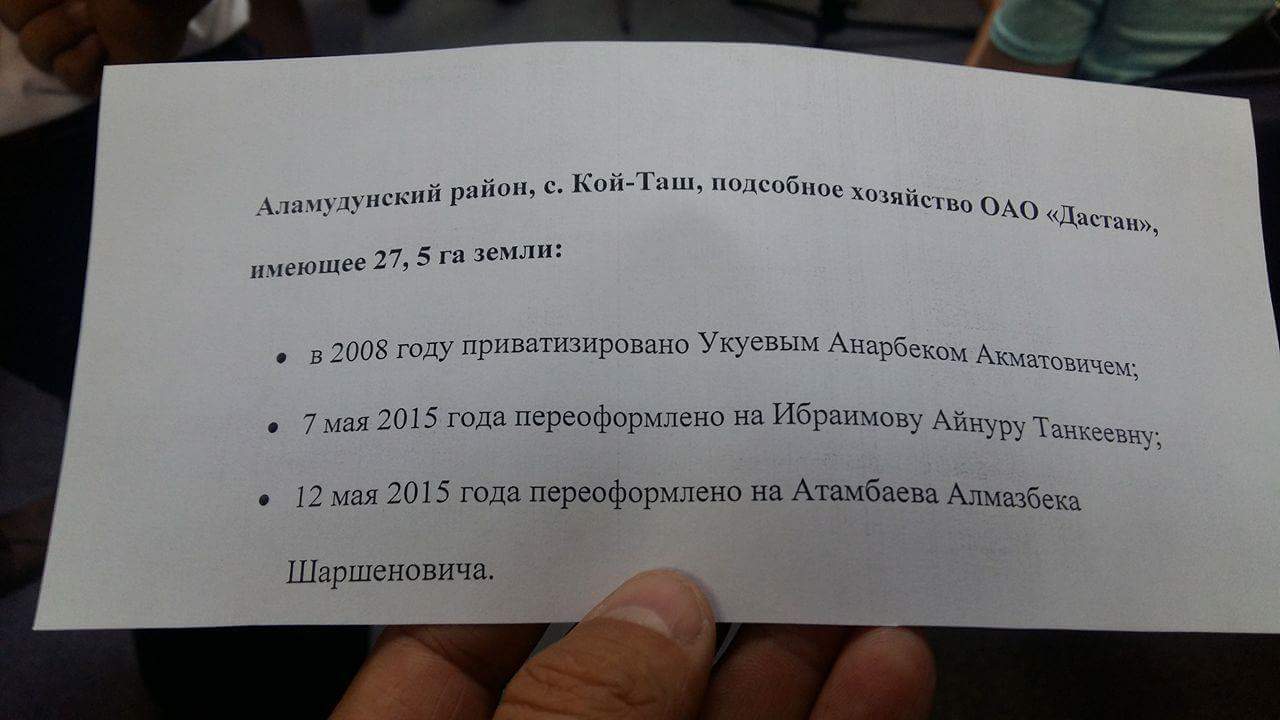 В декларации Алмазбека Атамбаева участок, на котором построен дворец в Кой-Таше и «некие строения», появились в 2015 году. Как выяснили журналисты — расследователи издания «Клооп» с 2008 по 2012 год эта земля принадлежала заводу «Дастан», затем она перешла к некоему Анарбеку Укуеву, а в 2015 году Алмазбек Атамбаев купил ее уже у Айнуры Ибраимовой, супруги Албека Ибраимова (Ибраимов с 2011 по 2012 год был председателем правления ОАО ТНК «Дастан». — Прим. 24.kg).Вся эта купля-продажа дурно пахнет даже без погружения в детали. Судите сами. Супруга Албека Ибраимова владела этим участком всего пять дней. С 12 по 17 мая.