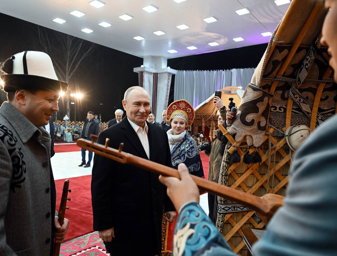 Во время экскурсии Владимира Путина заинтересовала игра молодого комузиста. Лидер России взял в руки инструмент и попытался повторить несколько аккордов, которые ему показал юный музыкант.