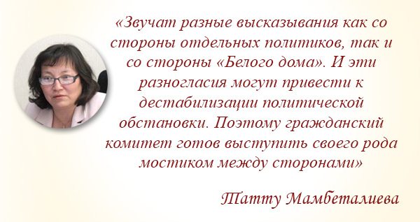 «По неподтвержденной информации, некоторые члены временного правительства пытаются изменить проект Основного закона, разработанный Конституционным совещанием и считавшийся окончательным», - заявляла тогда координатор комитета Татту Мамбеталиева.