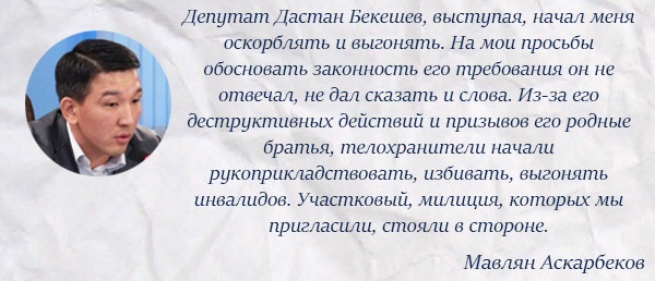 Мавлян Аскарбеков признается, что не понимает мотивов представителя президентской партии, дескать, никогда не оскорблял политика, не задевал его честь и достоинство. Он намерен в суде доказать, что это Бекешев постоянно оскорблял его. Противостояние между молодыми людьми идет давно и началось с конфликта в Кыргызском обществе слепых и глухих. По словам Аскарбекова, ранее к нему обратились его члены с просьбой помочь разрешить внутреннюю проблему. В частности, дело касалось распределения квартир для инвалидов по зрению и слуху.