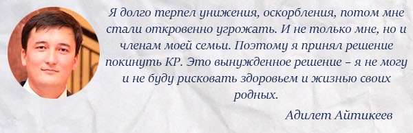 Еще один труженик пера, прославившейся после того, как взял интервью у брата свергнутого президента Курманбека Бакиева, Жаныша, приговоренного на родине к пожизненному сроку по многим статьям УК КР, главный редактор газеты «Искра» Адилет Айтикеев не стал дожидаться вызова на допрос и покинул Кыргызстан.