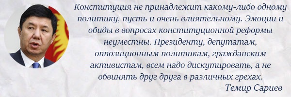«В ситуации, когда мнения разных сторон по реформе Конституции все больше отдаляются друг от друга, я предлагал и предлагаю создать независимый, временный орган – Конституционное совещание. Привлечь к работе в нем признанных юристов-конституционалистов, политологов, политиков как от власти, так и от оппозиции. Этот орган мог бы начать обсуждение вопросов реформирования Конституции уже в ближайшее время и спокойно, без эмоций, определить важные для реформы вопросы – сроки, процедуры и вопросы по содержанию предлагаемых для изменения статей», - сказал Темир Сариев.