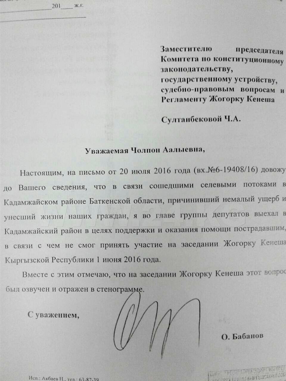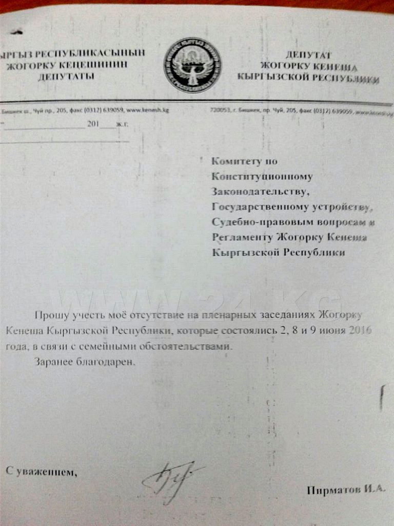В связи с выездом (в рабочие командировки) отсутствовали депутат от СДПК Абтандил Кулбараков (поездка в Джумгальский район), лидер РАЖ Омурбек Бабанов и депутат этой фракции Бактыбек Сыдыков (поездка в пострадавший от селей Кадамджайский район), а также Дастанбек Джумабеков («Кыргызстан»), который участвовал в раздаче гумпомощи детсадам Таласской области.