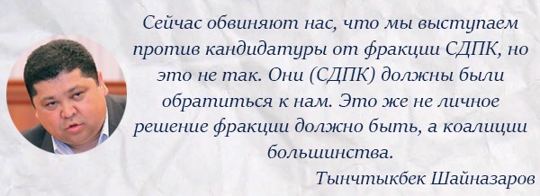 Поводом для разборок стала та самая персона Тынчтыкбека Шайназарова, выдвинутая ими на пост председателя комитета по конституционному законодательству, государственному устройству, судебно-правовым вопросам и регламенту. А фракция СДПК лоббирует Асель Кодуранову. Согласно коалиционной квоте кресло главы этого комитета принадлежит именно социал-демократам. Но в «Онугуу-Прогрессе» уперлись – Шайназаров будет выдвинут тоже. Союзников оскорбило, что социал-демократы, определяя своего выдвиженца, не посоветовались с другими членами коалиции. Это фактически подтвердил Тынчтыкбек Шайназаров.