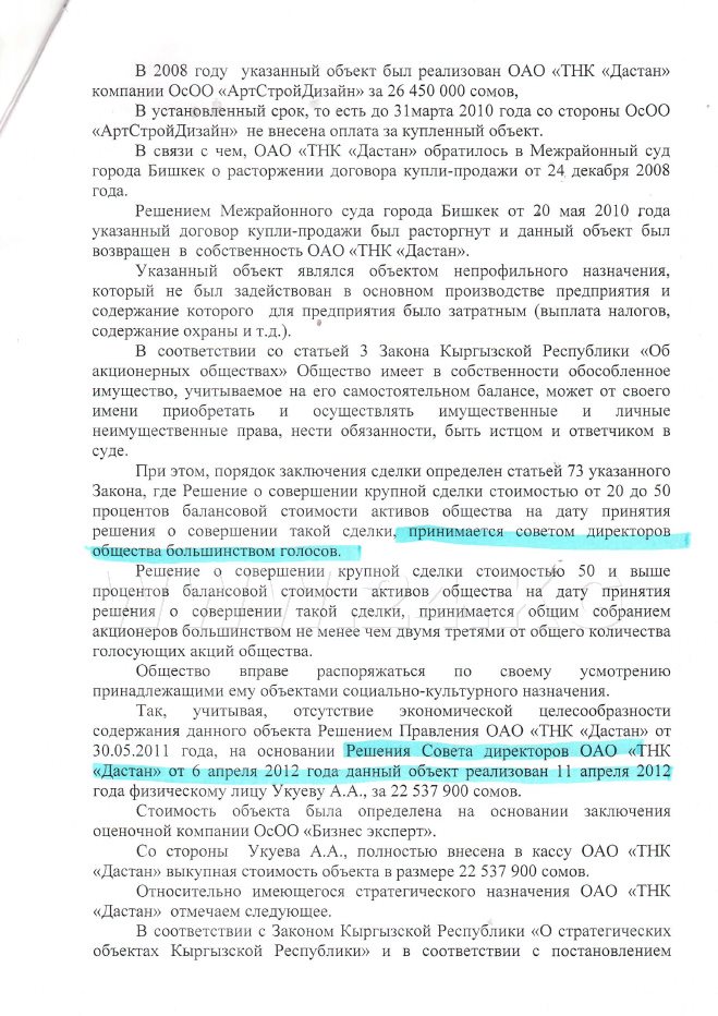 «Действительно, такое решение было, и в нем написано, что правление ТНК «Дастан», во главе которого стоял нынешний мэр Бишкека Албек Ибраимов, 30 мая 2011 года обратилось в совет директоров с просьбой продать данный участок. А совет директоров принял решение о реализации этого имущества 6 апреля 2012 года. Укуев этот участок приобретает 11 апреля 2012 года», - рассказал хронологию Омурбек Текебаев.