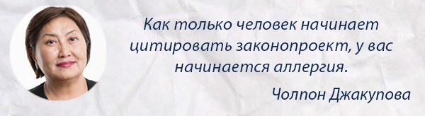 Однако та даже не стала отвечать, лишь повторяя, что «раз законопроект включен в повестку дня заседания, то надо решать вопросы путем голосования». На помощь Кодурановой пришел лидер фракции СДПК Иса Омуркулов, который сказал, что надо выступать в рамках регламента. В ответ Чолпон Джакупова заметила, что она говорит о соблюдении права.