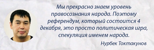 «Изменение Конституции-политическая игра и преступные замыслы по свержению существующего конституционного строя нынешней правящей группировки», - заявил сегодня на парламентских слушаниях по обсуждению законопроекта о назначении референдума глава ОО «Прецедент» Нурбек Токтакунов.