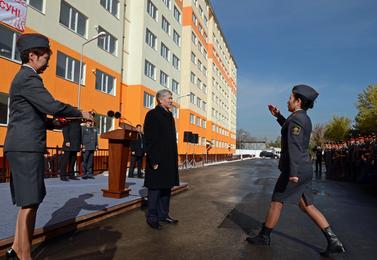 31 октября. Многоквартирные дома, построенные в Бишкеке для сотрудников милиции. Министру ВД вручил сертификат на 300 тысяч сомов для строительства детской площадки. Строительство трех домов для сотрудников МВД начато в январе 2016 года. На них выделено 437,9 миллиона сомов. Всего в трех домах 207 квартир.