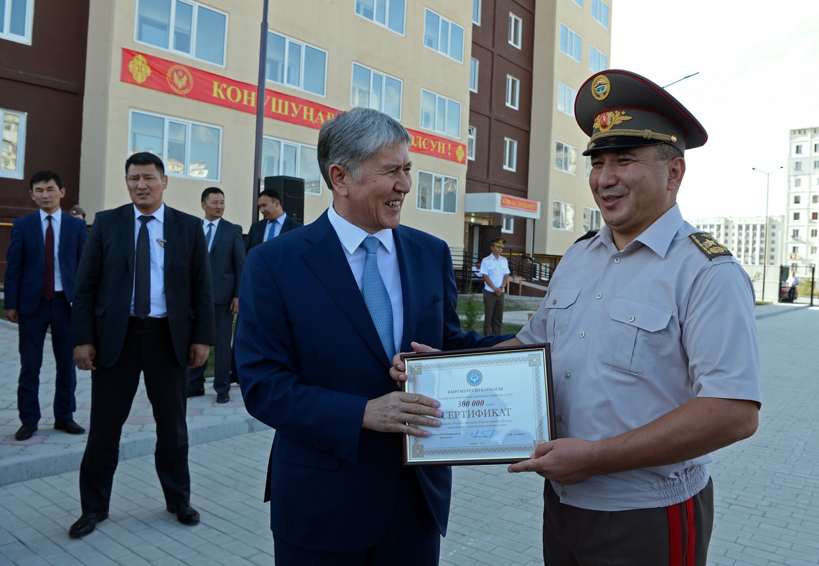 26 августа. Многоквартирный жилой дом в Бишкеке для военнослужащих Вооруженных сил. Начальник Генерального штаба ВС Раимберди Дуйшенбиев тогда получил сертификат на 300 тысяч сомов для строительства детской площадки у дома.
