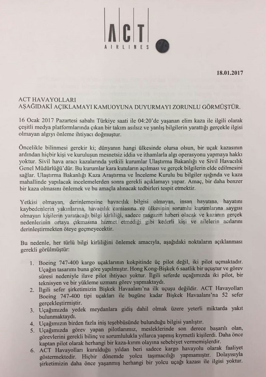 ACT Airlines отмечает, что работа компании была высоко оценена как турецкими авиационными властями, так и европейской комиссией по безопасности полетов, а также ИКАО.
