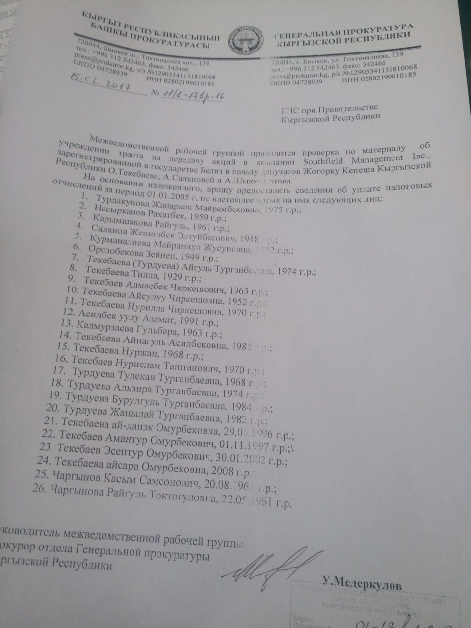 Официальное письмо из ГП за подписью руководителя межведомственной рабочей группы Медеркулова направлено в ГНС.
