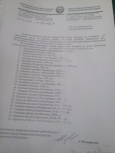 Запрос в ГНС направлен в связи с проверкой по материалам об учреждении траста на передачу акций в компании Southfield Management Inc., зарегистрированной в Белизе, в пользу Текебаева, Саляновой и Шыкмаматова.