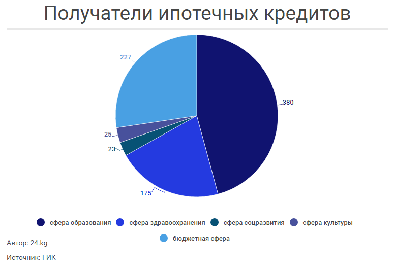 По его словам, на сегодня выдано 830 ипотечных кредитов — на 991 миллион 547,3 тысячи сомов. Работники сферы образования взяли 380 кредитов (на 427,9 миллиона сомов). Вслед за ними идут сотрудники сферы здравоохранения.