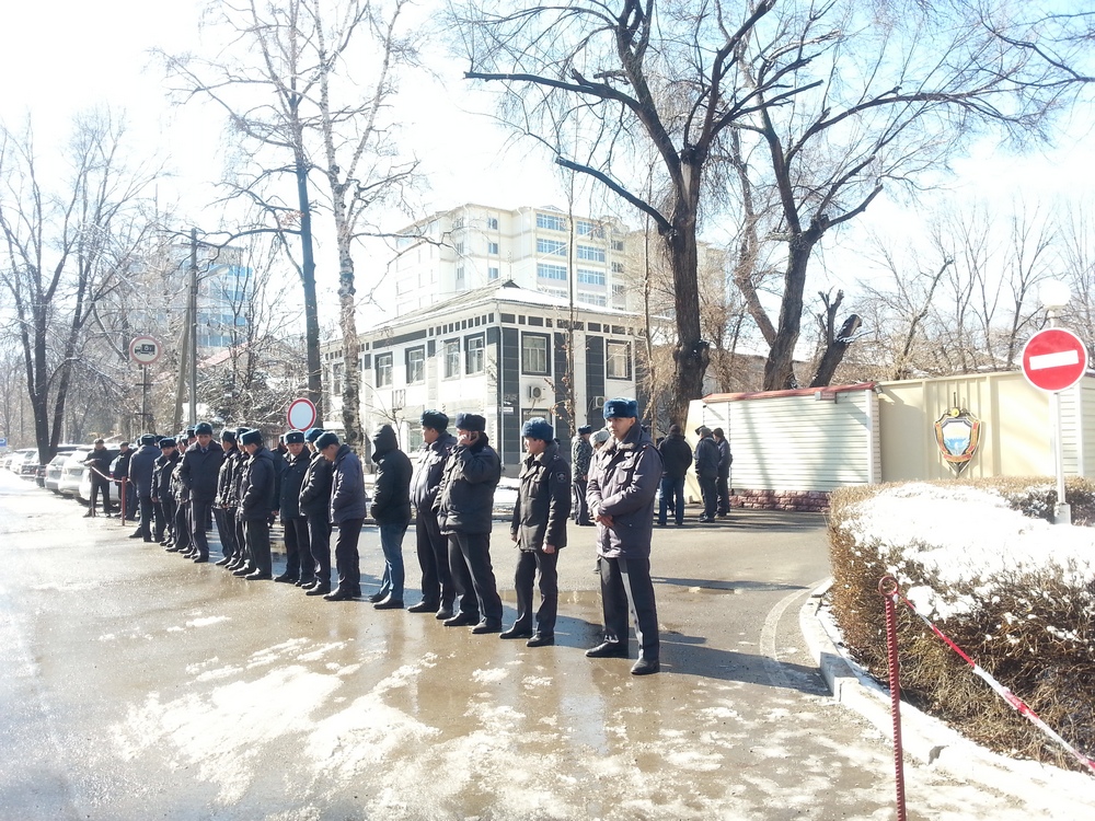 Здание ГКНБ оцепленно милицией. Из проезжающих машин доносятся крики: «Свободу Текебаеву!», «Свободу журналистам!».