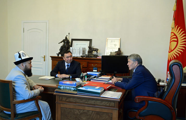 Президент Алмазбек Атамбаев принял директора Государственной комиссии по делам религий Зайырбека Эргешова и муфтия Максата ажи Токтомушева. Об этом сообщил отдел информационной политики аппарата президента КР.