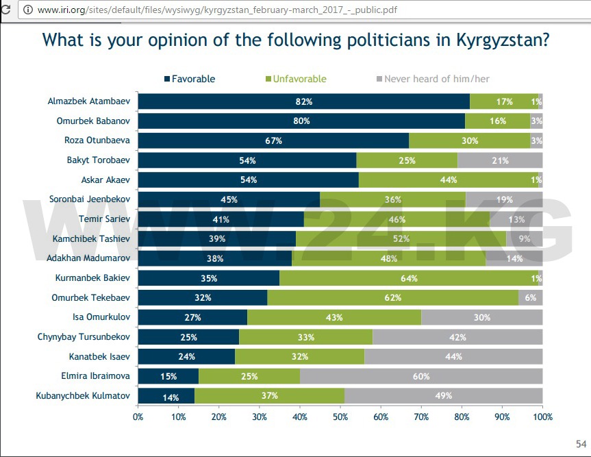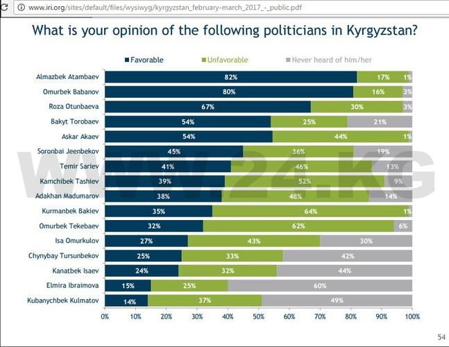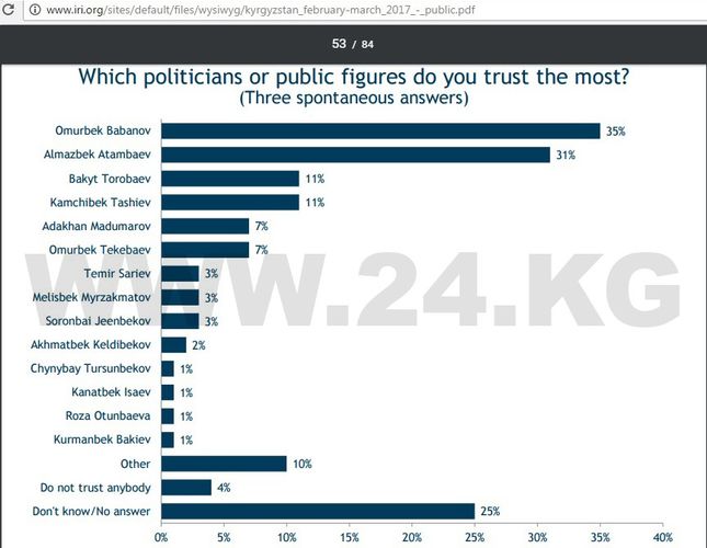 В числе прочих были вопросы и о конкретных личностях политиков. Первый вопрос звучал просто: «Каким политикам или общественным деятелям вы доверяете больше всего?». Здесь респонденты должны были дать три спонтанных ответа. В этой части у Омурбека Бабанова действительно лидерство. 35 процентов опрошенных назвали его имя.