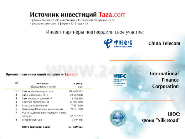 Если брать в расчет, что проект реализуют по примеру «Таза.com», то главным донором проекта будут совсем не международные финансовые институты, а ближайший сосед. Потенциальным инвестором проекта может стать китайская China Telecom.