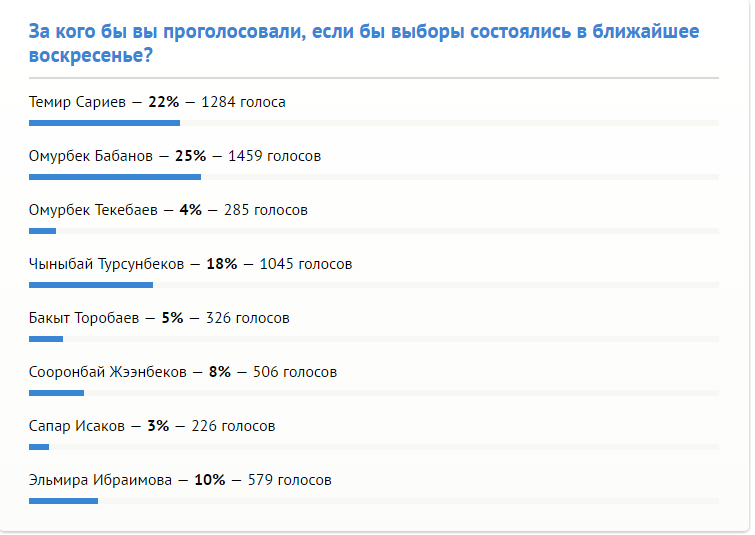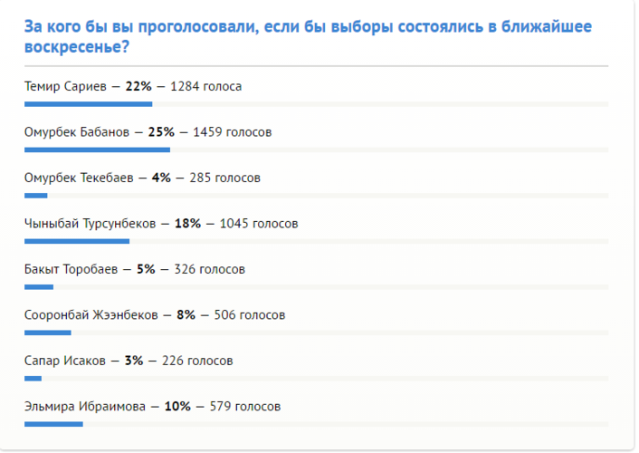 По итогам читательского голосования тройка лидеров выглядит следующим образом: 25 процентов у Омурбека Бабанова (1459 голосов), 22 процента — у Темира Сариева (1284 голоса), Чыныбай Турсунбеков — 18 процентов, или 1045 голосов.