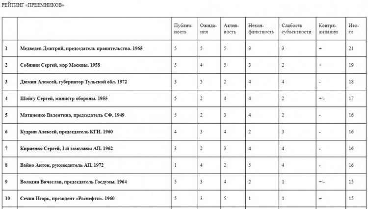Фонд «Петербурская политика» составил рейтинг возможных «преемников» Владимира Путина на посту президента Российской Федерации. Всего в списке 20 человек.