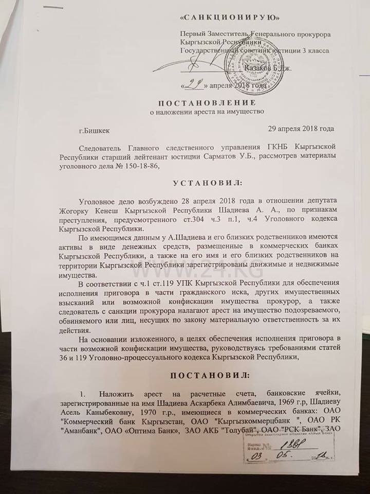 Ранее Арсена Закирова арестовали. Его задержали после проверки и возбуждения уголовного дела по статьям «Присвоение или растрата вверенного имущества» и «Подделка, изготовление, сбыт или использование поддельных документов, государственных наград, штампов, печатей, бланков» УК КР.
