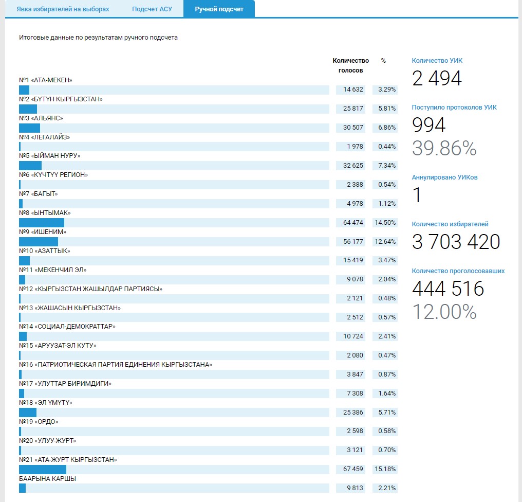 В Кыргызстане прошли выборы депутатов седьмого созыва Жогорку Кенеша. По предварительным данным Центризбиркома, 5-процентный порог преодолели шесть партий. Также есть предварительная информация, кто победил в одномандатных округах. Сейчас ведется ручной подсчет голосов.