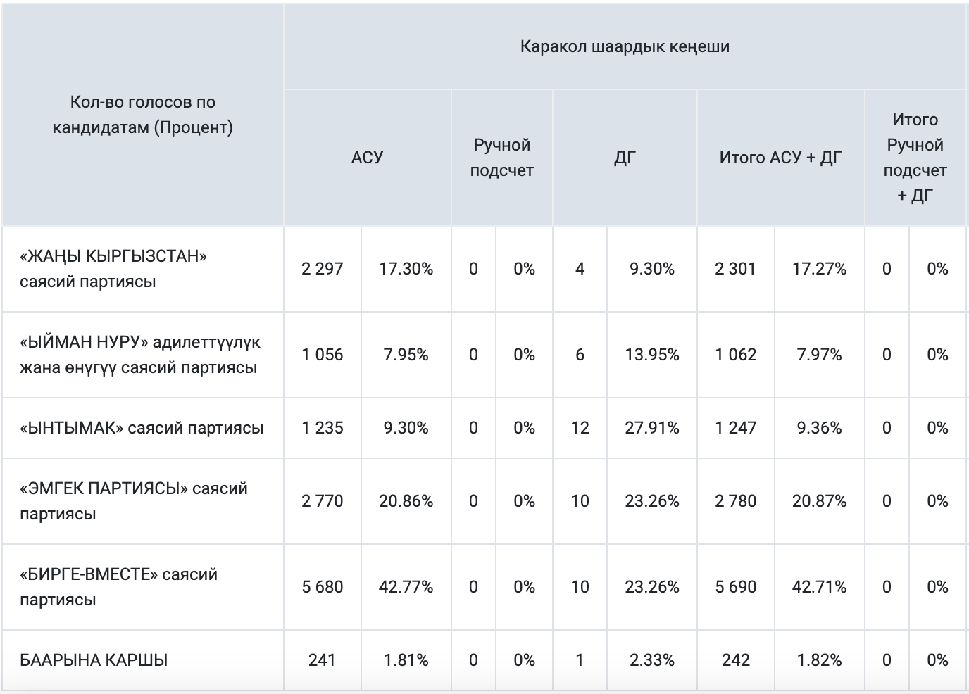По предварительным подсчетам АСУ, в Караколе побеждает партия «Бирге — Вместе», набрав 5 тысяч 680 голосов.