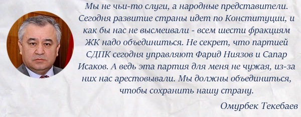 Несмотря на более чем жесткий обмен любезностями в День независимости, один из авторов обращения ВП против поправок в Основной закон Омурбек Текебаев призвал все фракции ЖК к объединению с… партией власти СДПК.