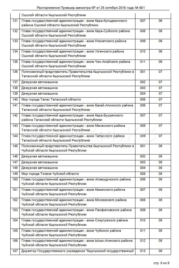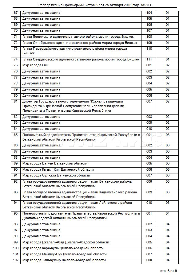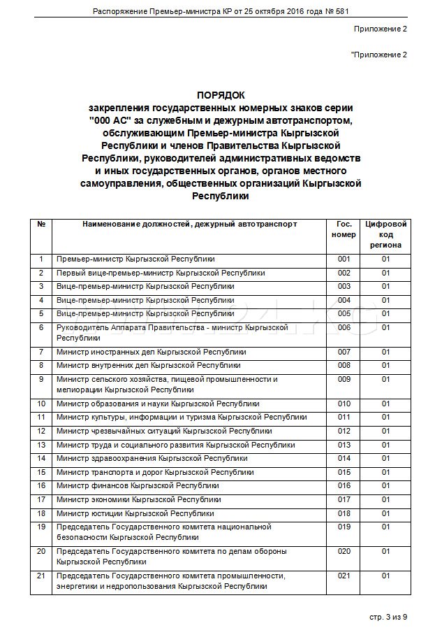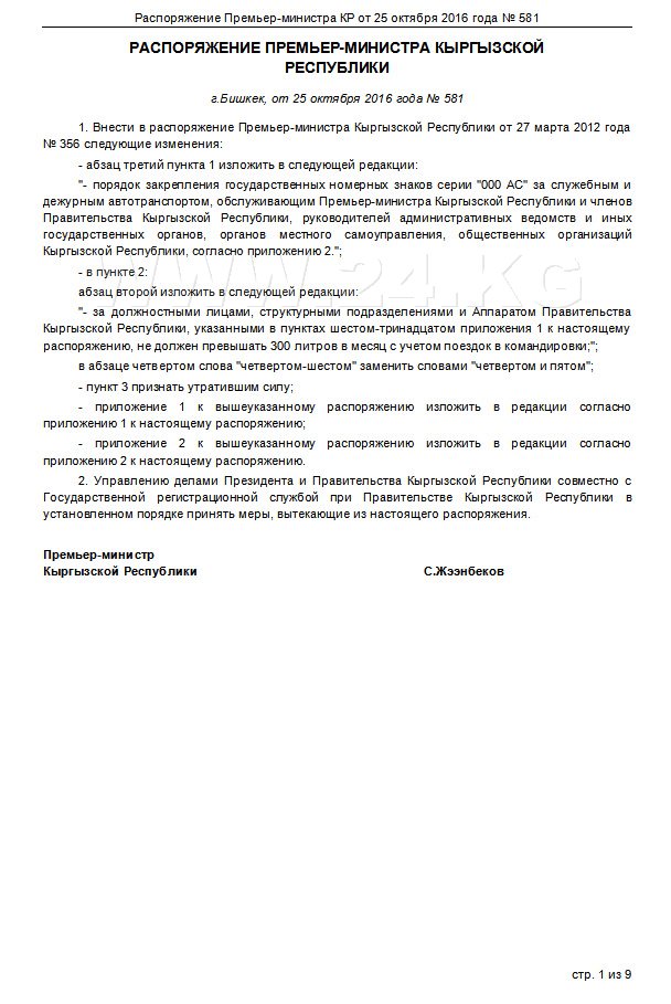 Увы, попрощаться со льготами на самом деле кабмин не торопится: 1 декабря на заседании ЖК депутат Акылбек Жамангулов заявил, что за правительством закреплены-таки госномера определенной серии — AC. Данную информацию ИА «24.kg» подтвердили и источникив ГРС, добавив, что их изготавливают по распоряжению премьер-министра Сооронбая Жээнбекова № 581 от 25 октября 2016 года.