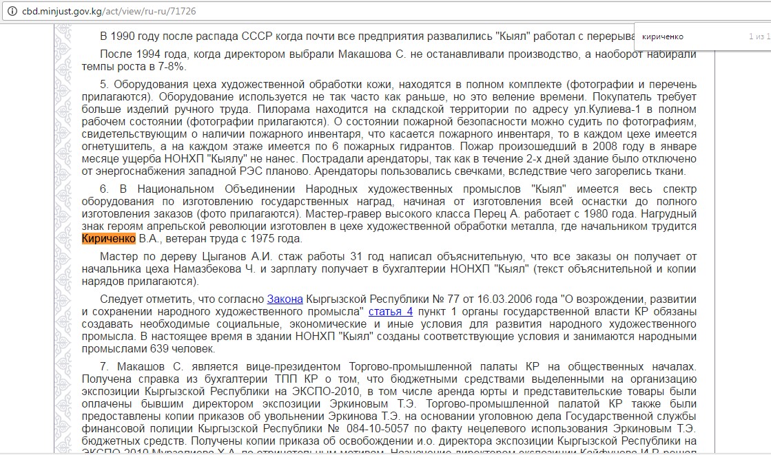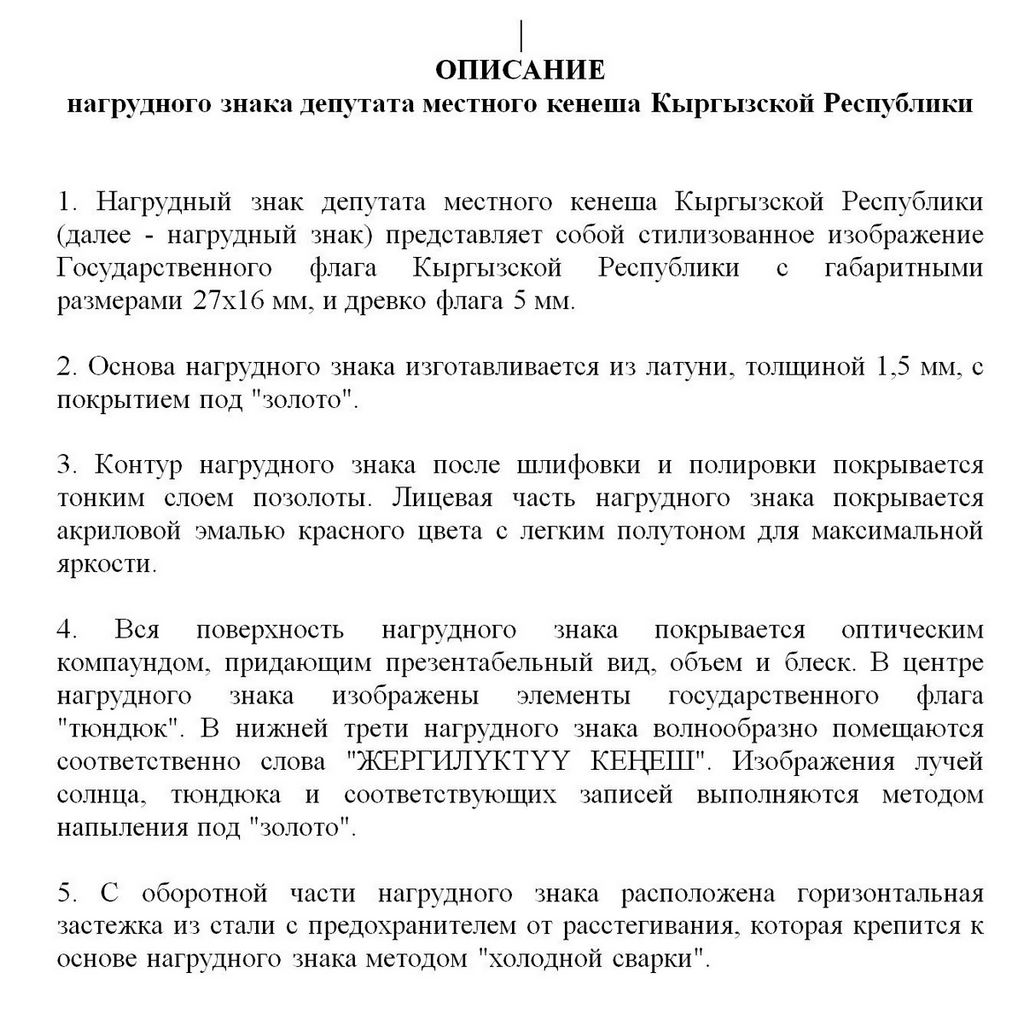 Еще довольно интересный момент. Например, эксперт по борьбе с коррупцией от «Бир Бола» Кайрат Осмоналиев прокомментировал в СМИ, что «комиссия для соответствия техническим требованиям к нагрудным значкам привлекла специалиста, мастера цеха НОНХП «Кыял», который дал свое заключение по наличию латунной основы в образцах нагрудных знаков, поданных участниками конкурса». Аргумент? Аргумент!