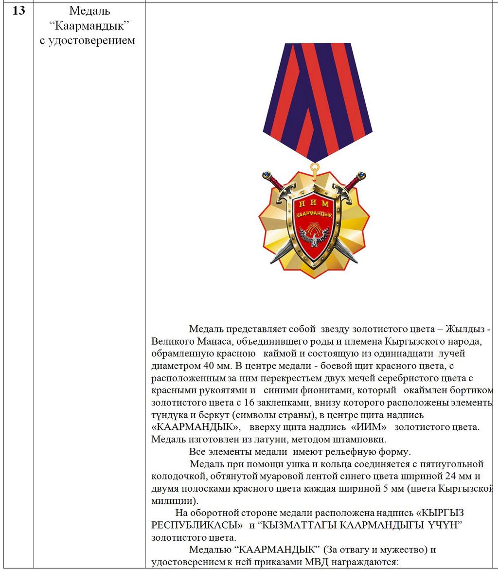 А теперь сравним. Из открытых источников стало известно, что в этом же году компания «Медальер» стала победителем тендера на приобретение ведомственных медалей с удостоверениями и нагрудных знаков от финансово-хозяйственного управления МВД КР. Тогда цена за изготовление медали (с учетом колодки, муаровой ленты, фианитов и удостоверения) составила - внимание! - всего лишь 200 сомов.