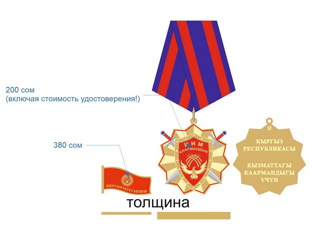Значит, правоохранители, ежедневно рискующие своей жизнью и несущие все тяготы службы, могут носить медали за 200 сомов, а депутатам местных кенешей позорно ходить со значками стоимостью 75 сомов. Логика бирболовца и по совместительству главы тендерной комиссии просто поражает!