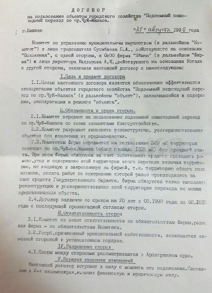 А, собственно, почему убираться, если есть договор на пользование объектом городского хозяйства «Подземный пешеходный переход по проспекту Чуй — Манаса» от 21 августа 1998 года сроком на 20 лет? Или в муниципалитете не знали о нем?