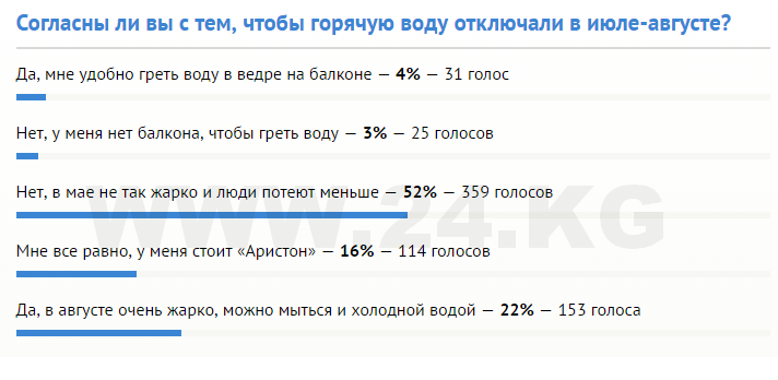 ИА «24.kg» провело опрос среди читателей и выяснило, что из 682 проголосовавших 359 против переноса отключения горячей воды с мая на июль. Только 31 человек согласен греть воду на балконе, а 153 готовы мыться холодной водой.