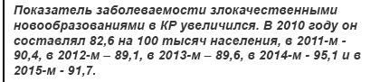 В Кыргызстане растет смертность от злокачественных новообразований. Умирают более половины взятых на учет раковых больных. Об этом сообщает консультант пресс-центра Минздрава Елена Баялинова.