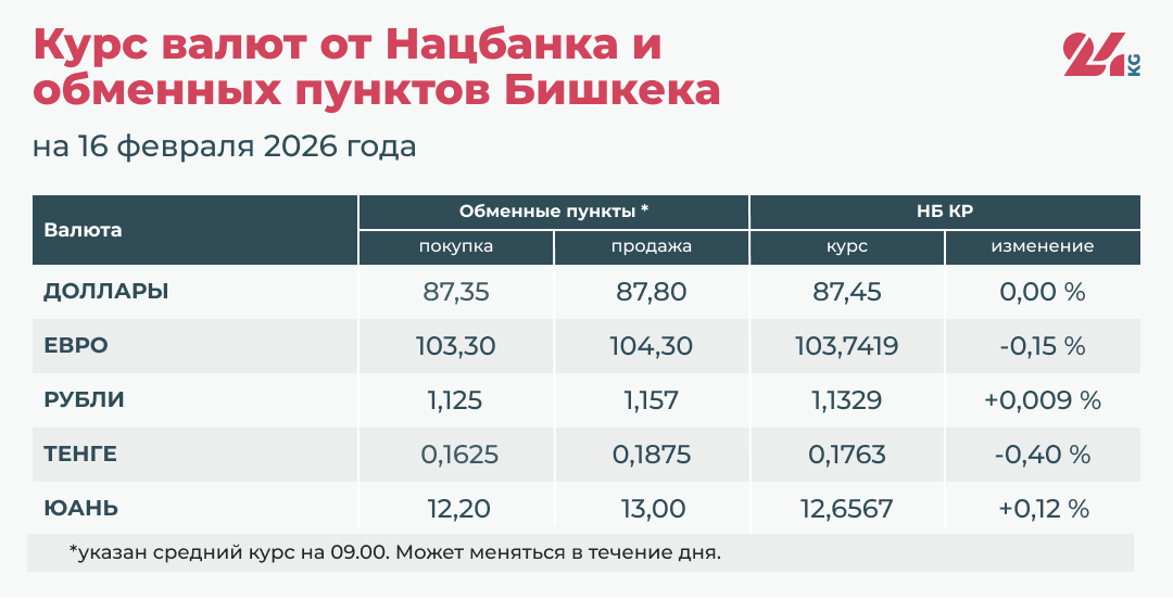 • Средний курс в обменных пунктах: покупка — 87,35 сома, продажа — 87,85 сома.