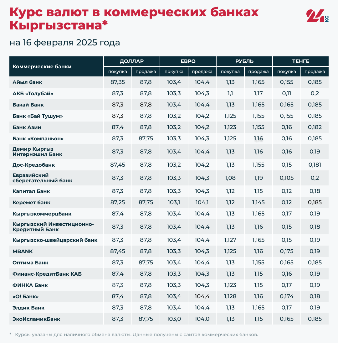 Курс валют в коммерческих банках Кыргызстана на 16 февраля