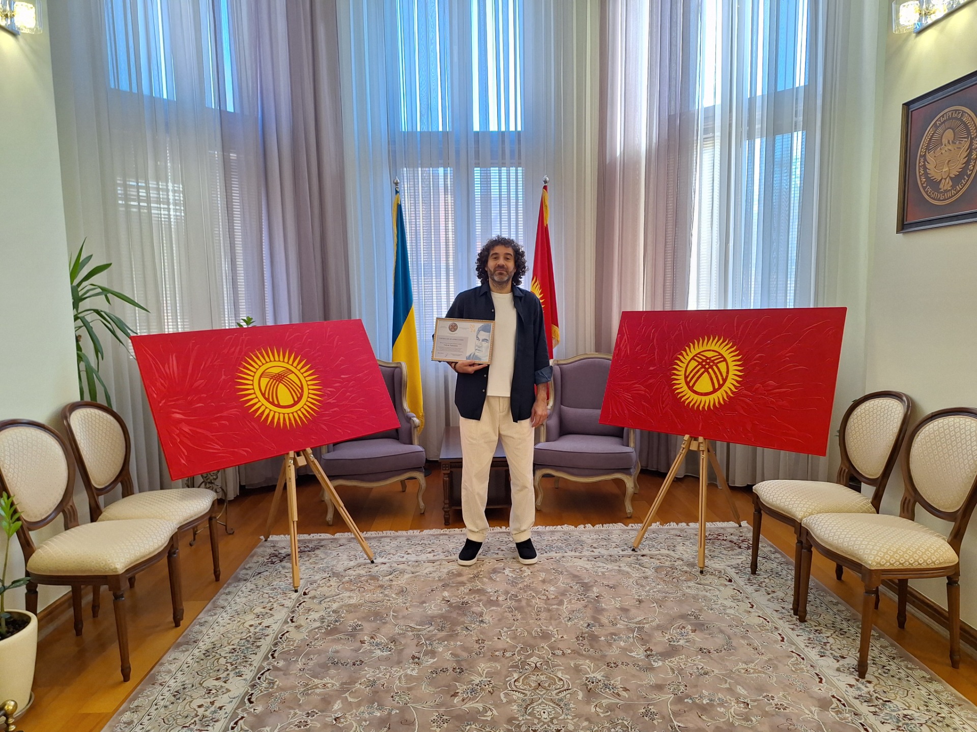 The solemn flag hoisting ceremony took place the day before at the diplomatic mission of the Kyrgyz Republic in Ukraine. Honorary Consuls in Kharkov Vadim Tumonyan and in Vinnytsia Alla Landar, Director of the Children’s National Library of Ukraine Alla Gordienko participated in it.