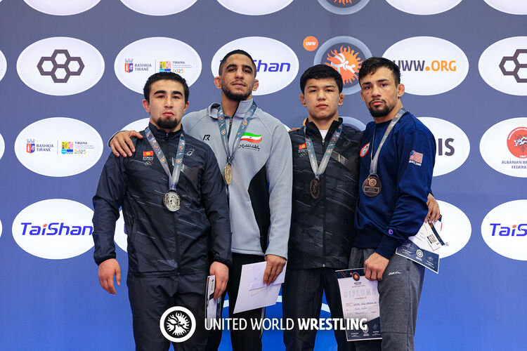 Фото UWW. Тайырбек Жумашбек уулу (солдо) жана Билал Шарип уулу (оңдон экинчи) подиумда