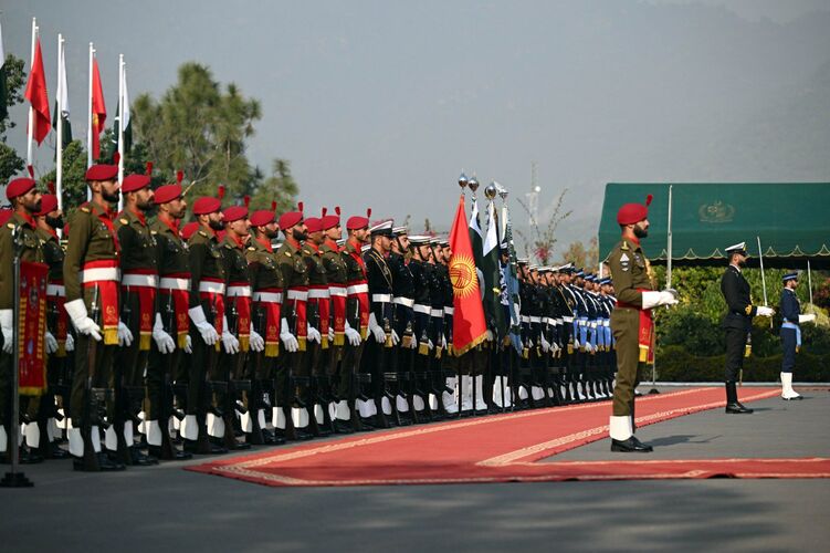 Президент Садыр Жапаровду Пакистандын премьер-министри Шахбаз Шариф тосуп алды. Саламдашуудан кийин эки өлкөнүн мамлекеттик гимндери аскердик оркестрдин коштоосунда жаңырды. Ардактуу кароол командири саламдашуу рапортун берди.